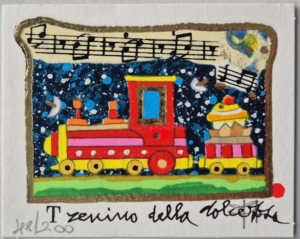 “Trenino della dolcezza“, serigrafia materica su carta, cm 8×10.