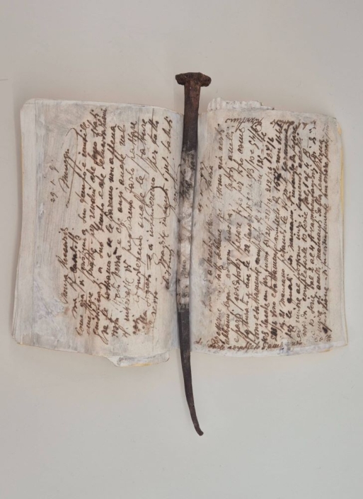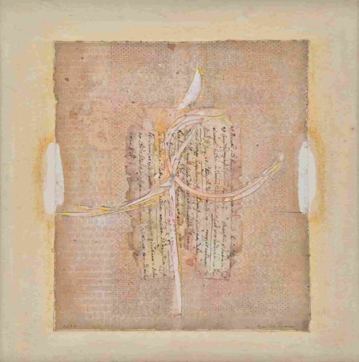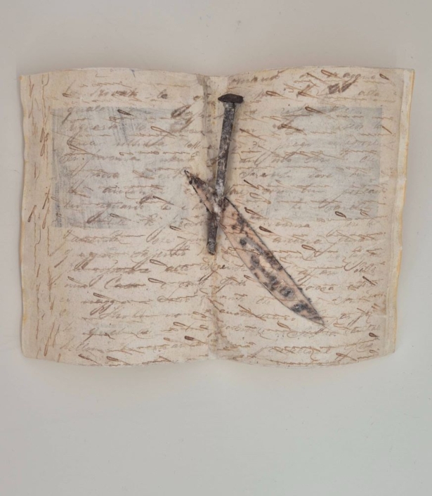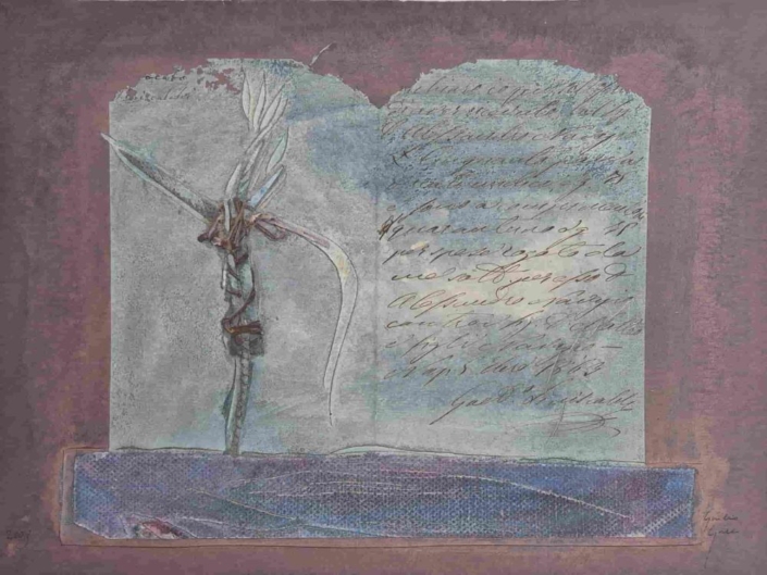 Tecnica mista su pagine di libro rigide con applicazione, cm 22x16.