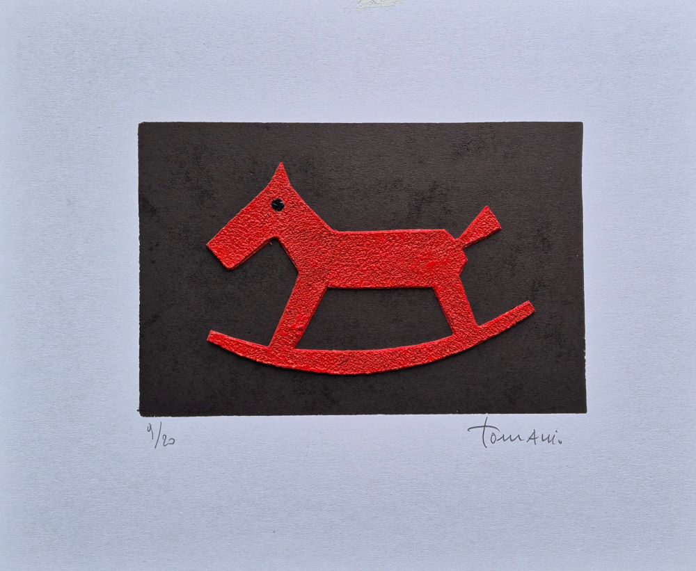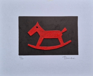 “Italo“, calcografia + collages su carta, cm 43×36 (rosso fondo nero)