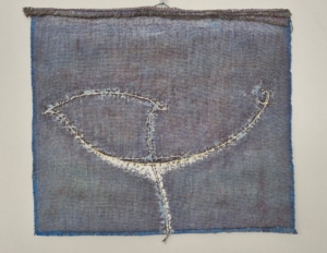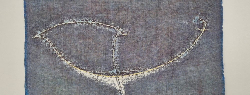 Un filo d’erba e la luna“, tecnica mista su tela di juta, cm 78×71.